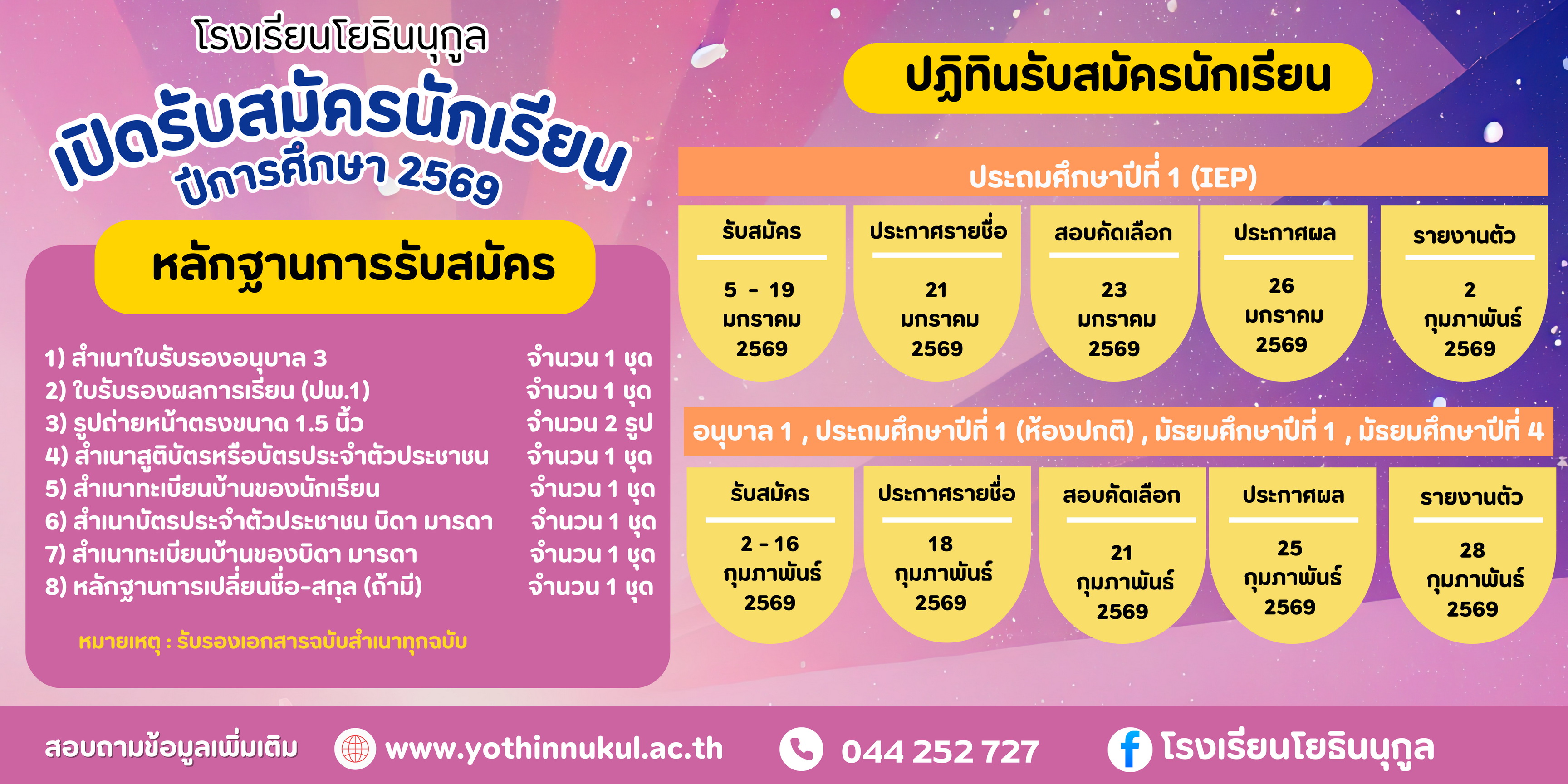 การรับสมัครนักเรียน ประจำปีการศึกษา 2569 ประเภทห้องเรียนพิเศษ (IEP) ระดับชั้นประถมศึกษาปีที่ 1 ระหว่างวันที่ 5 - 19 เดือน มกราคม พ.ศ. 2569 สมัครออนไลน์ (ไม่เว้นวันหยุดราชการ) และสมัครด้วยตนเอง ในเวลาราชการ 08.30-16.30 น. ที่ห้องธุรการ อาคารโยธินวัฒนา โรงเรียนโยธินนุกูล