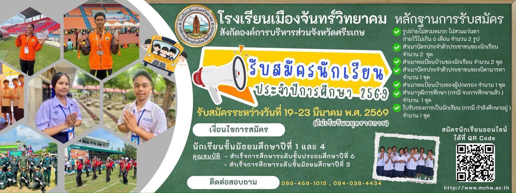 โรงเรียนเมืองจันทร์วิทยาคม เปิดรับสมัครนักเรียน ประจำปีการศึกษา 2569 ระหว่างวันที่ 19-23 มีนาคม 2569