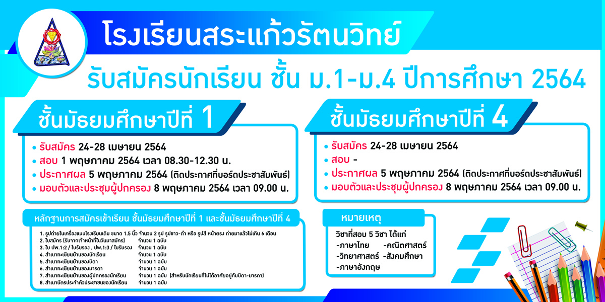 2. เดินทางมาสมัครที่ โรงเรียนสระแก้วรัตนวิทย์ เวลา 09.00 - 15.30 น.