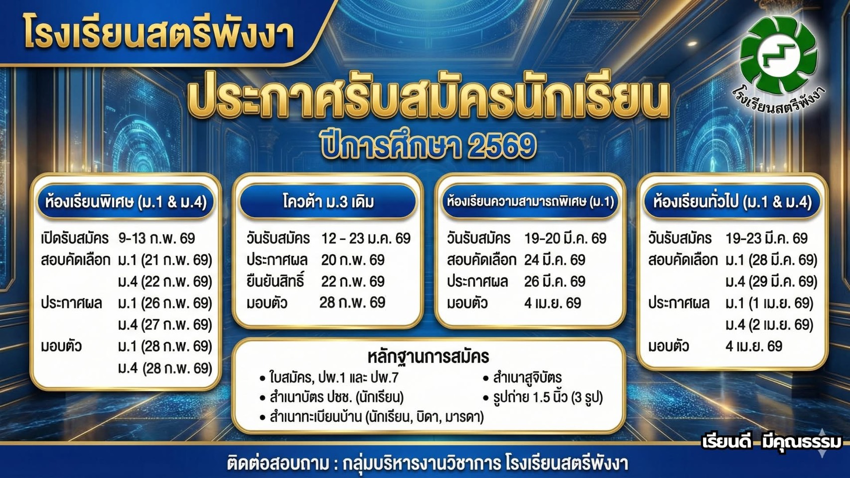 ระเบียบการรับสมัครนักเรียนโรงเรียนสตรีพังงา ปีการศึกษา 2569 (ออนไลน์)